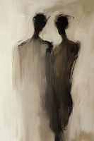 Dit schilderij ademt een stille, bijna tastbare verbondenheid uit. Twee menselijke silhouetten staan dicht naast elkaar, weergegeven in zachte, vloeiende penseelstreken. Hun vormen zijn niet scherp omlijnd, maar lijken als het ware op te gaan in de omringende ruimte. Hierdoor ontstaat het gevoel dat de grenzen tussen de figuren en hun…