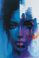 Dit kunstwerk, met zijn levendige combinatie van blauwe en paarse tinten vermengd met oranje en witte accenten, biedt een diepgaande kijk op menselijke emotie. De subtiele tranen die langs het gezicht van de vrouw stromen, benadrukken een innerlijke worsteling die vaak verborgen blijft voor de buitenwereld. Dit krachtige stuk is een meesterlijke uitdrukking van de complexiteit van de menselijke psyche, waarbij kleur en abstractie samenkomen om een moment van kwetsbaarheid en schoonheid vast te leggen.