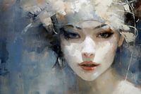 Verborgen Emoties - Hier zie je een intrigerend portret vol emotie, waarbij de aanwezigheid van een masker—waarvan slechts een glimp te zien is—een mysterieuze dimensie toevoegt. De koele blauwe en neutrale tinten balanceren mooi met de warme accenten van de huidtinten. De losse, expressieve penseelstreken geven het portret een moderne twist en benadrukken de diepte van de verborgen verhalen achter dit raadselachtige gezicht.