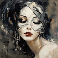 Verborgen Gelaatstrekken | Modern Portret - Op dit doek zie je een sfeervol portret van een vrouw, waarbij de nadruk op haar masker en oorbellen ligt. Het kleurenpalet is voornamelijk neutraal met accenten van gouden en doorleefde aardetinten, terwijl de losse, expressieve penseelstreken een moderne flair geven. Het masker voegt een intrigerende laag toe; het verbergt en onthult tegelijk, een spel van identiteit en mysterie, wat ruimte laat voor interpretatie.