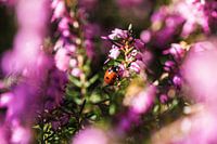 Deze foto toont een lieveheersbeestje verscholen tussen winterheide bloesems. De onscherpe bloemen op de voorgrond omlijsten het beeld en creëren diepte, waardoor het insect bijna verborgen lijkt in een zee van kleur. Het warme rood contrasteert subtiel met het zachte roze, wat de compositie levendig maar toch harmonieus maakt.