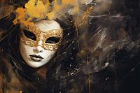 Verborgen Gouden Mystiek | Masker Portret - In een spel van mysterie en elegantie toont dit portret een gemaskerd figuur tegen een achtergrond van gelaagd zwart en gouden spatten, die diepte en textuur brengen. Het masker, verfijnd met goudkleurige accenten, speelt met thema's van verborgen identiteiten en onuitgesproken verhalen. De dynamische contrasten en abstracte penseelstreken vangen een gevoel van geheimzinnigheid, terwijl de gouden elementen een vleugje dramatiek toevoegen.