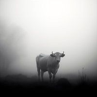 De mist omringt de koe in deze foto, waardoor een beeld ontstaat dat de grens tussen realiteit en fantasie doet vervagen. Dit zou een prachtige toevoeging zijn aan de hal of de ontvangstruimte van een huis, waardoor een intrigerend gespreksonderwerp ontstaat voor gasten.