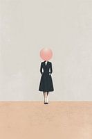 Een surrealistische illustratie met een minimalistische uitstraling toont een vrouw in een elegante zwarte jurk met een roze ballonvormig hoofd. De strakke compositie tegen een lichte achtergrond creëert een intrigerende spanning tussen klassieke mode en moderne abstractie, waarbij het contrast tussen de aardse tint van de vloer en de zachte grijze muur de mysterieuze sfeer versterkt.