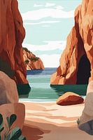 Een serene digitale illustratie van een verborgen baai, omringd door imposante roestbruine kliffen die als natuurlijke wachters het turquoise water omarmen. Een intiem strand met zacht zand vormt de perfecte uitnodiging voor contemplatie, terwijl subtiele vegetatie de rotsformaties siert en het geheel een mediterraans gevoel uitstraalt.