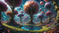 In dit werk openbaart zich een landschap dat de grenzen van realiteit tart, een plaats waar de natuurwetten buigen en zich vormen naar de verbeelding. Bomen met levendige, karmozijnrode en zachte mauve bladeren rijzen op uit een weelderig, groen tapijt. Hun stammen zijn stevig geworteld in een bodem die rijkelijk bezaaid is met bloemen…