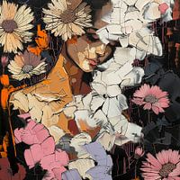 Expressieve en delicate compositie waarin een vrouwelijk figuur en een overvloed aan bloemen harmonieus samensmelten. De vrouw, met een serene en introspectieve uitdrukking, lijkt bijna te verdwijnen tussen de bloemblaadjes die in zachte pastelkleuren zijn weergegeven. De bloemen variëren in tinten van wit, roze en beige, met enkele accenten van oranje die een levendig contrast bieden.