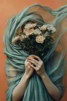 Een surrealistisch portret waarin een figuur gehuld is in zwevende, turquoise stoffen, met het gezicht verborgen achter een boeket crèmekleurige rozen. Delicate handen houden de bloemen vast, terwijl de stoffen een elegante beweging suggereren tegen een warme oranje achtergrond. Deze mysterieuze compositie vervaagt de grenzen tussen mens en natuur, en nodigt uit tot contemplatie over schoonheid en identiteit.