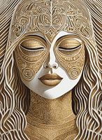 In het mystieke rijk van dromen en sterrenstof, waar de grens tussen werkelijkheid en verbeelding vervaagt, verscheen een betoverend schilderij. Het toonde het gezicht van een vrouw, haar ogen gesloten als poorten naar onbekende werelden. Haar lange haar, geweven van draden wit en goud, danste in de zachte bries van de kosmos. Op haar gezicht lag een gouden tekening, als een symbool van innerlijke wijsheid en verlichting.