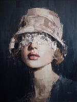 'Verborgen Blik' is een semi-abstract portret van een mooie vrouw dat meteen intrigeert en een licht ongemakkelijk, bijna bizar gevoel oproept – precies dat maakt het zo interessant. Het werk ademt een sfeer die doet denken aan de jaren 1930: een tijd van elegantie, mysterie en verfijnde mode. Het kleine hoedje en het kant dat haar ogen…