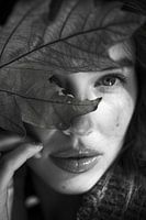 Dompel jezelf onder in de fascinerende samensmelting van mens en natuur met dit indrukwekkende zwart-wit portret. De smetteloze schoonheid van een vrouwengezicht, omlijst door gedetailleerde bladeren, trekt de kijker mee in een surrealistische wereld waarin de grenzen tussen natuur en mens vervagen. De fijn bewerkte sproeten en de intense diepte van de blik geven de foto een bijna hypnotiserende allure. Dit kunstwerk is ideaal voor liefhebbers van zwart-wit fotografie en surrealistische werelden. Het zal je zintuigen betoveren en een vleugje mysterie brengen in elke kamer.