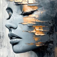 Dit indrukwekkende kunstwerk combineert de esthetiek van een modern portret met de dynamische textuur van abstracte schilderkunst. Opvallend is het bladgoud over het gezicht en de achtergrond. Deze gouden accenten breken het monochrome kleurenpalet en geven het kunstwerk een luxe en toch moderne uitstraling. Het gestructureerde oppervlak en de krachtige penseelstreken benadrukken de diepte en levendigheid van het schilderij, waardoor het een echte blikvanger wordt. Perfect voor eigentijdse interieurs die elegantie en stijl uitstralen. De unieke gezichten zijn gemaakt in samenwerking met innovatieve AI.