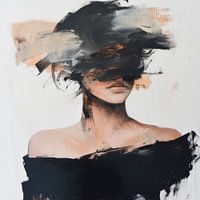 Een mysterieuze aanwezigheid ontvouwt zich, terwijl krachtige penseelstreken het gezicht verbergen achter een sluier van zwart en zachte aardetinten. De zachte onthulling van de schouders en de delicate uitdrukking van de lippen wekken nieuwsgierigheid op naar het onbekende. De compositie balanceert tussen identiteit en anonimiteit, een beklemmend moment tussen werkelijkheid en abstractie.