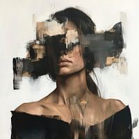 Het silhouet van een vrouw glinstert in een fascinerend spel van licht en schaduw, haar gezicht gedeeltelijk verborgen door abstracte kleurvlakken. De krachtige penseelstreken brengen een diepe emotie over, terwijl de zachte contouren van haar schouders een contrast vormen met de dynamische rusteloosheid boven haar hoofd. Een beklemmend beeld van innerlijke onrust.