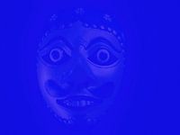 Statisch portret, een gezicht, dat langzaam zichtbaar lijkt te worden vanuit een blauw vlak.