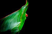 Een feloranje oog glinstert tussen het diepgroene blad, gevangen in een zee van zwart. Deze minimalistische en mysterieuze natuurfoto speelt met contrast, stilte en spanning. Het intense rood van de roodoogmakikikker steekt krachtig af tegen het donkere decor, waardoor het beeld bijna abstract aanvoelt.