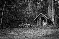 Deze foto toont een verlaten houten schuur diep verscholen in de Ardennen, omringd door dicht bos en ruige natuur.