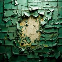 Dit kunstwerk vangt op indrukwekkende wijze het gevoel van vergankelijkheid en verval. De groene kleur van de afbrokkelende muur lijkt in eerste instantie intens en levendig, maar een nadere blik onthult de fragiele aard van het oppervlak, dat uit elkaar valt in talloze scheuren en afbladderende panelen. Het contrast tussen het weelderige groen en de blootgelegde lagen eronder, die een blekere, bijna aardse tint hebben, creëert een beklemmende visuele spanning. Deze blootgelegde lagen herinneren aan het onvermijdelijke verval dat alles wat kunstmatig is overleeft, en tegelijkertijd aan de lagen geschiedenis die verborgen liggen.