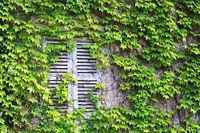 Traditionele Franse houten luiken (shutters, raamluiken, vensterluiken) in een venster, omgeven door de klimplant Wilde Wingerd, in de zomer. Een romantisch Mediterraan plaatje van de binnenplaats van een cottage in de Elzas, Frankrijk. Leuk als tuinposter.
