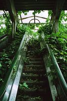 De foto toont een verlaten roltrap die overwoekerd is door weelderige groene vegetatie. De verweerde treden zijn nauwelijks herkenbaar tussen het dichte gebladerte, terwijl het licht door het beschadigde dak stroomt. Deze scène straalt een bijzondere mengeling van natuur en vergankelijkheid uit die de stedelijke ruimte herovert.