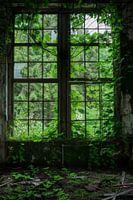 De foto toont een overwoekerd raam met uitzicht op een weelderig groen landschap. Klimplanten en bladeren omlijsten de gebroken ruiten en creëren een gevoel van vergankelijkheid. Het contrast tussen de levende natuur en de verwaarloosde ruimte vertelt een verhaal van wedergeboorte en de onstuitbare kracht van de natuur.