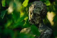 Verborgen wijsheid tussen zachte bladeren: een mysterieuze buste die doet denken aan poëtische verhalen en vervlogen tijden. De delicate gezichtsuitdrukking en het verweerde materiaal geven elke kamer een ontspannen, artistieke sfeer. Ideaal voor de woonkamer - een blikvanger die uitnodigt om te blijven hangen en na te denken.