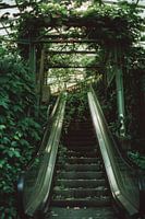 De foto toont een trap omgeven door weelderig groen die naar een lichtovergoten bovenverdieping leidt. De glanzende trapleuningen van de roltrap staan in een spannend contrast met de wilde vegetatie die de treden omringt. Dit landschap straalt een gevoel van vergeten schoonheid uit, waar natuur en architectuur harmonieus in elkaar overgaan.