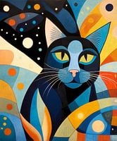 Een kat is afgebeeld met een betoverende blik, omringd door levendige geometrische vormen en wervelende kleuren die beweging oproepen. Het gebruik van blauwe, gele en oranje tinten creëert een harmonieuze mix die de mystieke kwaliteit van de scène versterkt. De compositie combineert elementen van abstractie met een sterk gevoel voor…