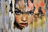 Het schilderij toont het gezicht van een vrouw, gedeeltelijk verborgen achter een beschadigde muur, met tranen of kleur die naar beneden stromen. Het symboliseert kwetsbaarheid en veerkracht. Op de achtergrond is een kleinere, verdrietige figuur te zien, die de emotionele diepte van het tafereel vergroot.