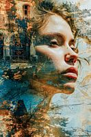 In dit beeld wordt het gezicht van een vrouw omringd door gefragmenteerde architecturale details en een abstracte, getextureerde achtergrond. Het beeld geeft het gevoel dat de verhalen en herinneringen van deze muren diep geworteld zijn in de afgebeelde persoon. De rijke aardetinten en het turquoise op de achtergrond benadrukken de levendigheid van de structuren, die ondanks hun verval aanwezig blijven.