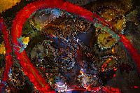 Een explosieve compositie van wervelende, felle kleuren doorsneden door dynamische rode lijnen creëert een beeld van rauwe energie en innerlijke onrust. Het lijkt alsof verborgen, organische structuren worden onthuld in een kosmische storm.