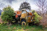 Ergens op het Zuider eiland, Nieuw Zeeland, staat deze vrachtwagen bijna verborgen in de bosjes. Hij staat te vergaan en te verroesten. De prachtige kleuren van de roest en de mosjes maken het tot een geweldig kunstwerk.