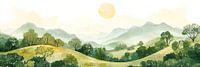 Verdant Serenade - Dit is een abstract schilderij met glooiende heuvels en gestileerde bomen, gehuld in zachte kleurschakeringen van groen en geel onder een dominerende zachte zon.