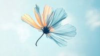 Deze compositie toont een bloem in volle beweging, vastgelegd vanuit een onverwacht perspectief. De bloemblaadjes spreiden zich uit in een zachte draaiing, alsof ze zweven op een zuchtje wind. De kleurverdeling loopt van lichtblauw naar warme perziktinten, met een donkere kern als visueel ankerpunt.