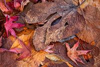 het verdorde blad van een vijgenboom omringd door andere bladeren in het arboretum tijdens de herfst