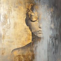 vrouwelijk portret dat gedeeltelijk lijkt te verdwijnen in een abstracte waas van texturen en kleuren. De linkerzijde van het gezicht en lichaam is gehuld in warme goud- en bruintinten, terwijl de rechterzijde oplost in een koele, grijze mist van penseelstreken. Deze overgang creëert een vervagend effect, alsof de figuur zich tussen…