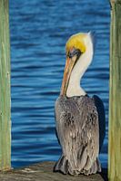 Koop dit vogel kunstwerk Verenigde Staten, Florida, Bruine pelikaan op promenade voor water van adventure-photos op canvas, aluminium dibond, (ingelijste) fotoprint, behang en ArtFrame, op maat geprint in Fine-Art kwaliteit.