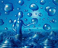 Het surrealistische blauwe schilderij toont een figuur van water, omringd door vallende waterdruppels, elk gevuld met een vis, die zich verenigen in een golvend wateroppervlak.