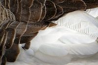 Dit is close-up van een verenkleed van een gans. Mooi glanzend bruin verenkleed in contrast met het glanzende witte verenkleed. Merk op dat het net geregend had en dat er druppels op het verenkleed zitten. Die veren zijn waterafstotend en de druppels blijven er gewoon op liggen.