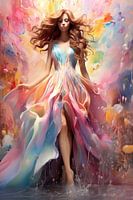 Met dit digitaal gemaakt werk heb ik getracht een model aan te kleden in een vloeibare verf jurk. Het is een prachtig werk voor aan de muur geworden in levendige maar toch zachte tinten.