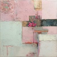 Een abstract kunstwerk waarin zachte pasteltinten domineren, met name mint-groen en verschillende tinten roze. De compositie bestaat uit geometrische vlakken met een verweerde, textuurrijke uitstraling. Een kleine cluster roze rozen vormt een delicaat accent tegen een achtergrond van verweerde muurvlakken en subtiele decoratieve elementen. Het geheel straalt een rustgevende, vintage elegantie uit.