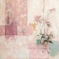Een delicaat collage waarin abstractie en botanische elementen samensmelten in een harmonisch geheel. De compositie wordt gedomineerd door zachte pasteltinten in roze, beige en turquoise, geometrisch verdeeld in vlakken met subtiele texturen. Rechts in het beeld ontspringen verfijnde roze bloemen met groene bladeren, die een natuurlijke elegantie toevoegen aan het abstracte kleurenspel.