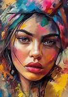 Indringend portret dat de kijker direct aanspreekt. Het gezicht van de vrouw is gedetailleerd en realistisch weergegeven, met een blik die tegelijkertijd kracht en zachtheid uitstraalt. Het kleurgebruik is uitbundig en varieert van warme aardetinten tot koele blauw- en paarstinten, wat een levendige en haast tastbare textuur creëert. De spatten en streken van verf lijken willekeurig maar zijn met precisie aangebracht, wat een gevoel van spontaniteit en beweging geeft.