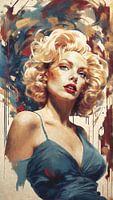 De figuur in het schilderij straalt een bepaalde ingetogen kracht uit, iets wat verder gaat dan uiterlijke verschijning. De warme, gouden tonen in haar haar contrasteren prachtig met de koelere blauwtinten van haar jurk, wat haar tegelijkertijd aards en etherisch maakt. Haar blik is zowel verleidelijk als melancholisch, waardoor de kijker wordt uitgenodigd om verder te kijken dan het oppervlak en de verhalen te ontdekken die in haar ogen liggen verscholen.