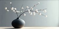 Deze minimalistische compositie toont subtiele schoonheid in eenvoud. Boomtakken met witte, wollige bloesems steken af tegen een rustige, grijze achtergrond en staan in een donkere, eivormige vaas op een houten oppervlak. Het werk straalt kalmte en evenwicht uit.