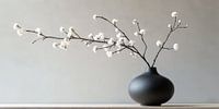Dit kunstwerk toont een gestileerde, minimalistische compositie van een kale tak met witte bloesems in een donkere vaas. Het creëert een meditatieve spanning tussen de verfijnde, kwetsbare schoonheid van de natuur en de verstilde, sobere sfeer. Het roept een gevoel van sereniteit en tijdloze gratie op, waarbij de essentie van de natuur gevierd wordt in haar meest pure vorm.