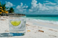 Een verfrissend glas bruisend water en een schijfje limoen op fijn, wit zand - dat pure vakantiegevoel! De kabbelende golven en de helderblauwe lucht creëren een sfeer van ontspanning. Ideaal voor in de woonkamer om de zintuigen te stimuleren en de geest te verfrissen. Een kleine vakantie voor de ogen!