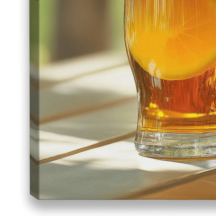 Een verfrissend drankje, perfect overgoten met een heldergeel schijfje citroen, geeft het gevoel van een zonnige middag. De gouden kleur en schuimende rand stralen een uitnodigende frisheid en levensvreugde uit. Dit kunstwerk zou prachtig staan in een keuken of een gezellige buitenruimte en de zomerse sfeer verspreiden.