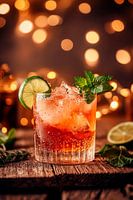 In een glinsterend moment ontvouwt zich een verfrissende cocktail met pittige fizz, overgoten met een vleugje limoen en frisgroen muntblad. De warme lichtvlekken op de achtergrond geven het drankje een feestelijk tintje. Perfect voor in de woonkamer om gezellige avonden met vrienden te vieren en de sfeer op te vrolijken.