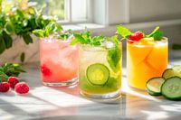 Frisse kleuren en sprankelende aroma's vangen het licht en geven de ruimte een uitnodigende sfeer. De stijlvolle cocktails met komkommer, frambozen en een vleugje munt zetten aan tot zomer en ontspanning. Ideaal voor de keuken of woonkamer om gezelligheid en joie de vivre te vieren!